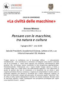 Dall’idea di rivedere il rapporto uomini-macchine nasce la conferenza intitolata “Pensare con le macchine, tra natura e cultura” che il Dott. Stefano Moriggi, filosofo e storico della scienza, terrà il 5 giugno 2017 nell’ambito del Ciclo “La civiltà delle macchine” organizzato dal Centro per la Storia delle Idee UNIMORE, in collaborazione con l’Accademia Nazionale di Scienze, Lettere e Arti di Modena.